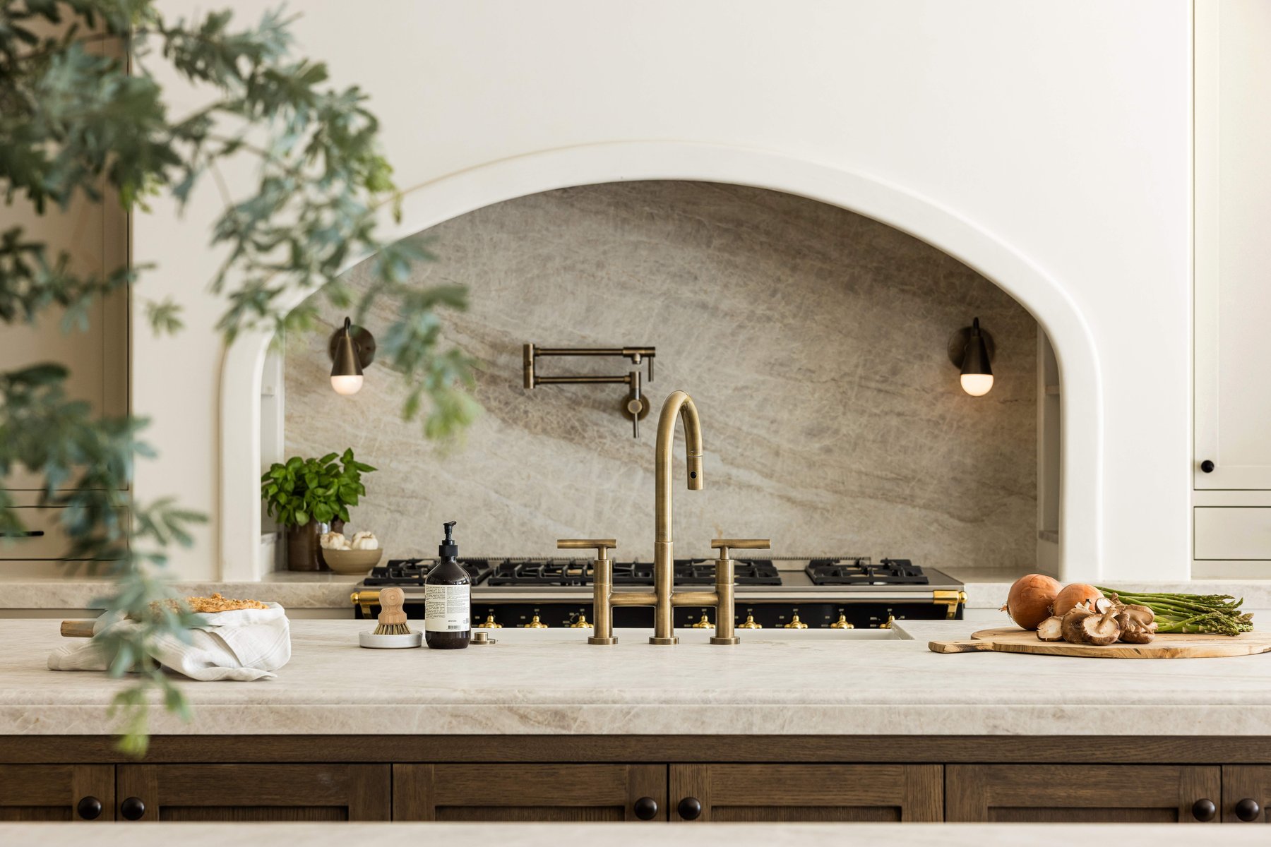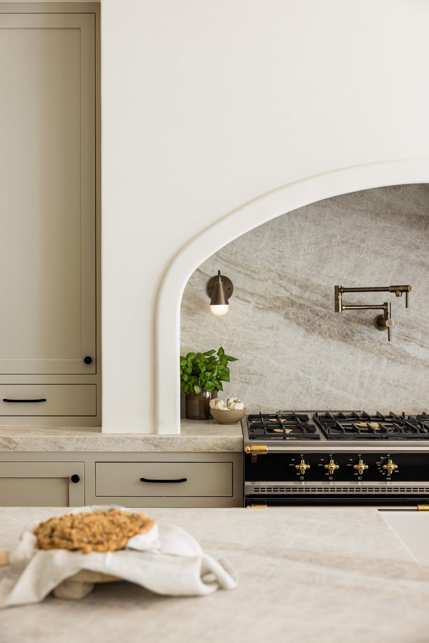 At the center of the kitchen, a sculpted plaster hood draws the eye and creates a focal point that feels architectural yet understated. It’s the kind of detail that doesn’t demand attention, but rewards it—a quiet expression of craftsmanship that elevates the entire space.