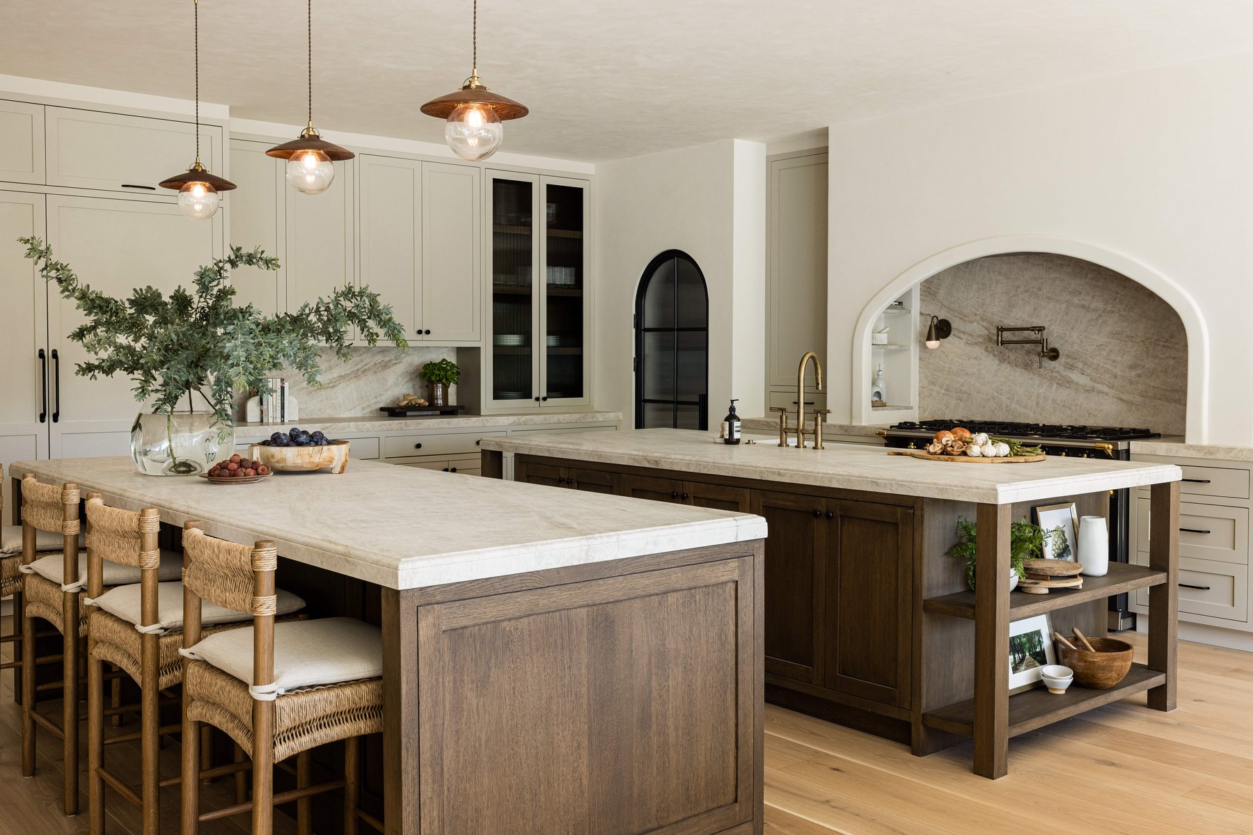 The cabinetry is finished in a soft, creamy hue, grounding the kitchen in calm neutrality. Against this backdrop, stained oak islands offer warmth and dimension, celebrating the natural texture of wood and bringing an organic richness that ties the space to the broader material palette of the home.