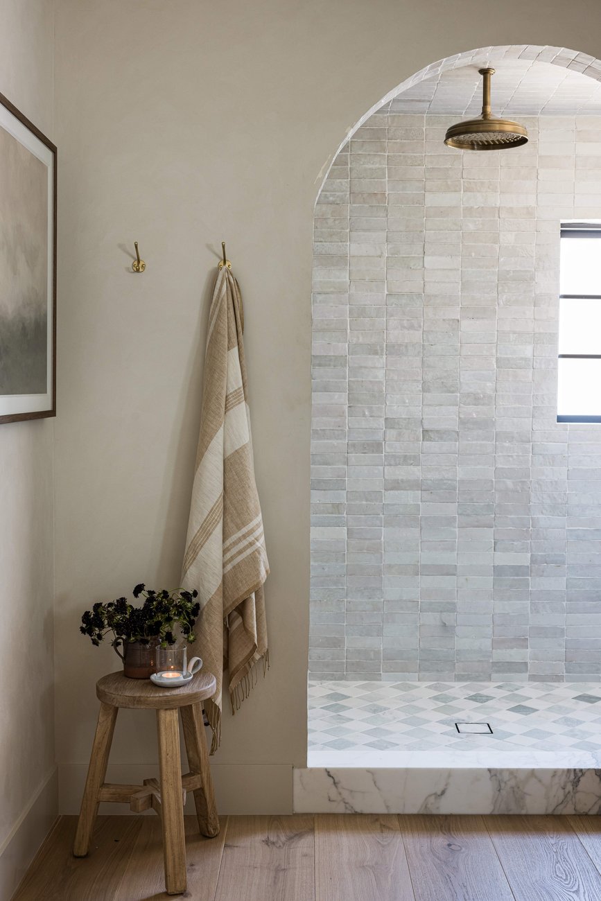The adjoining primary bath echoes the same material story: stone, plaster, and patinated brass form a palette both earthy and elevated. Hand-troweled plaster walls shift subtly with the light, creating movement that feels almost meditative. Honed stone underfoot adds texture and grounding, while brass fixtures offer warmth and the promise of a beautiful patina over time.