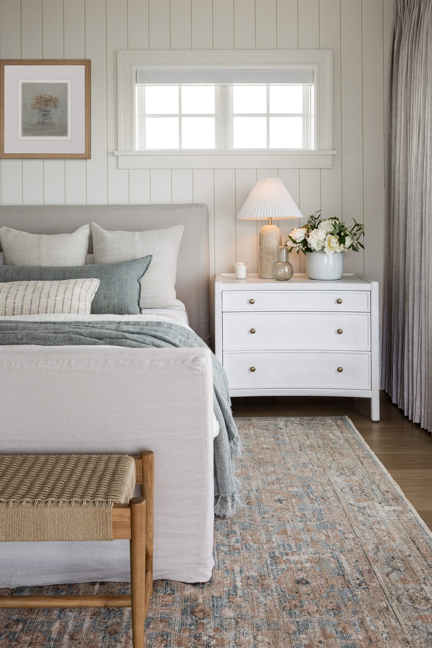 The palette is intentionally restrained: muted neutrals and soft, cool coastal tones create visual serenity without distraction. Linen and cotton layers invite restfulness. Painted paneling adds subtle dimension. Light flows effortlessly through the space, dancing across carefully chosen materials and creating a sense of airiness and movement.