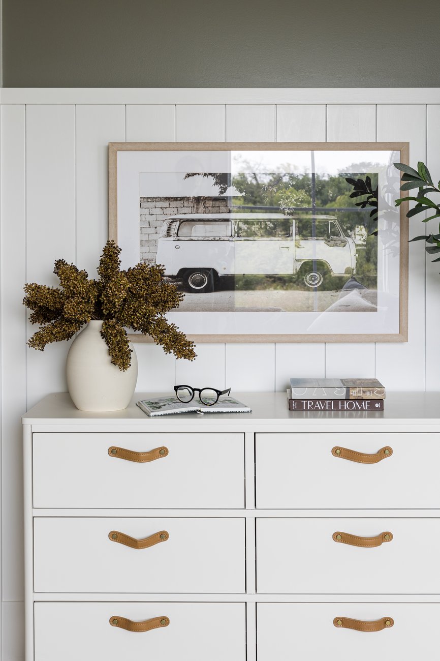 This is a classic spot to showcase a favorite piece. Keep your furniture low and grounded to let the artwork shine. The art should offer balance and height—centered or off-center depending on the feel you want. Style the surface with stacked books, table lamps, vessels, or a bowl to add texture and volume beneath the artwork.