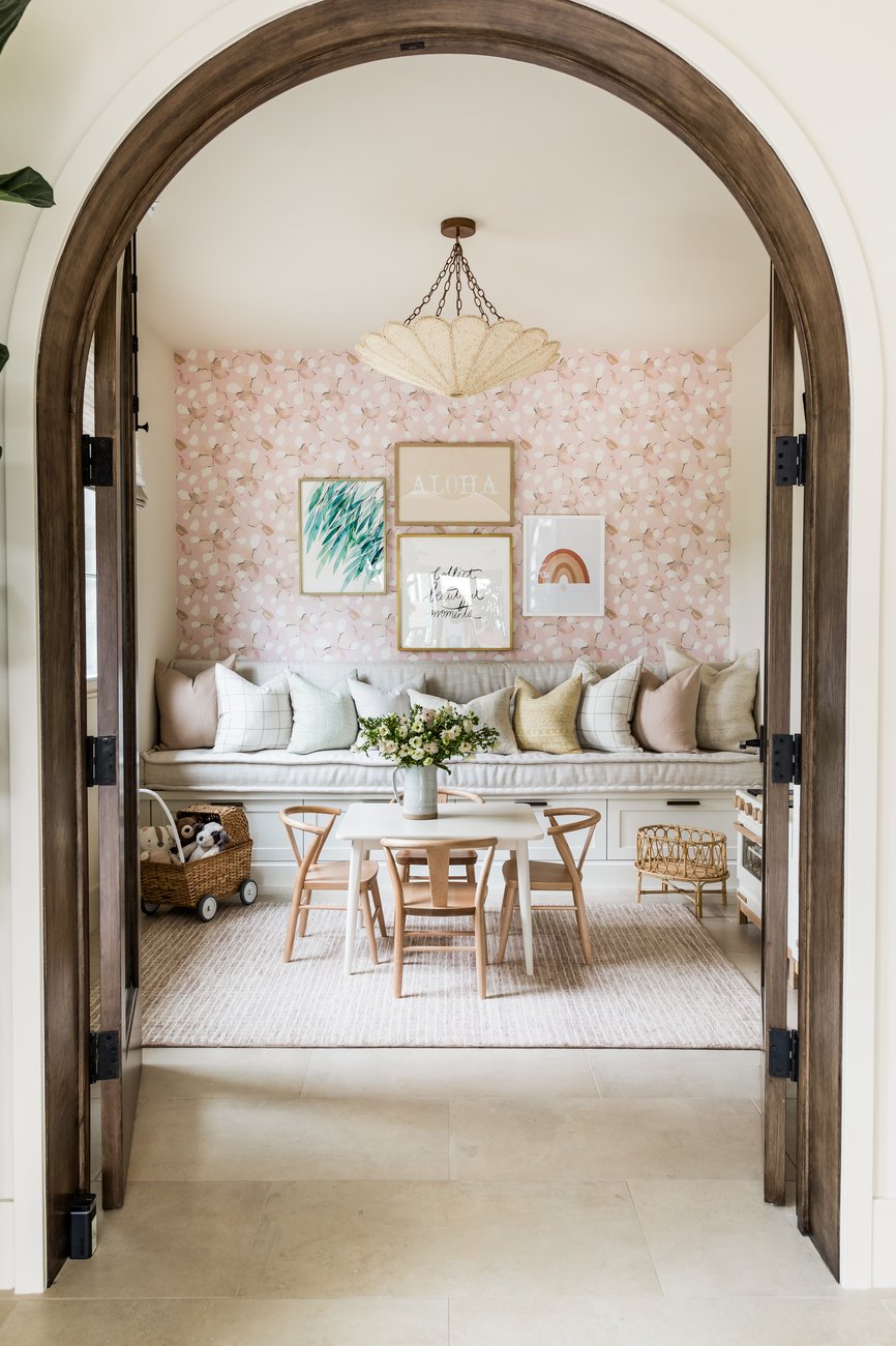 With two young girls, the kids rooms are sweetly designed with whimsical elements and feminine touches. A statement feature of the home is the playroom with arched doors, a focal wall, and built-in bench seat. This is a space the kids can enjoy completely, tucked away in their own world.