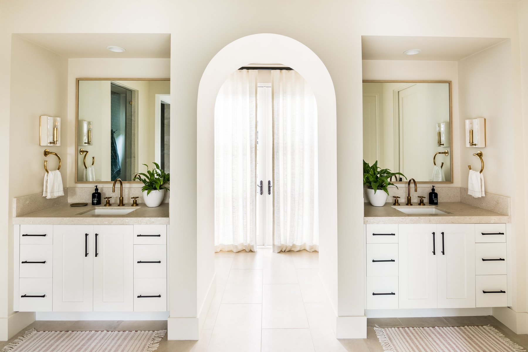 Stepping into the living room of Coastal Canyon, you meet a space that balances laid-back California comfort with refined coastal restraint. Light floods in through generous windows, bouncing off white-washed walls and soft neutral finishes. A clean-lined sectional anchors the room layered with natural-toned pillows and throws, offering casual comfort without clutter. With arched built-ins on either side of the mantel, the living room is equally cozy as it is architectural. The overall vibe is calm and grounded: an inviting great room where family life, casual lounging, or intimate evenings feel equally at home.