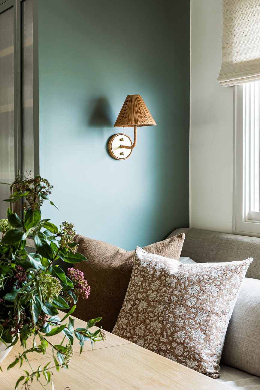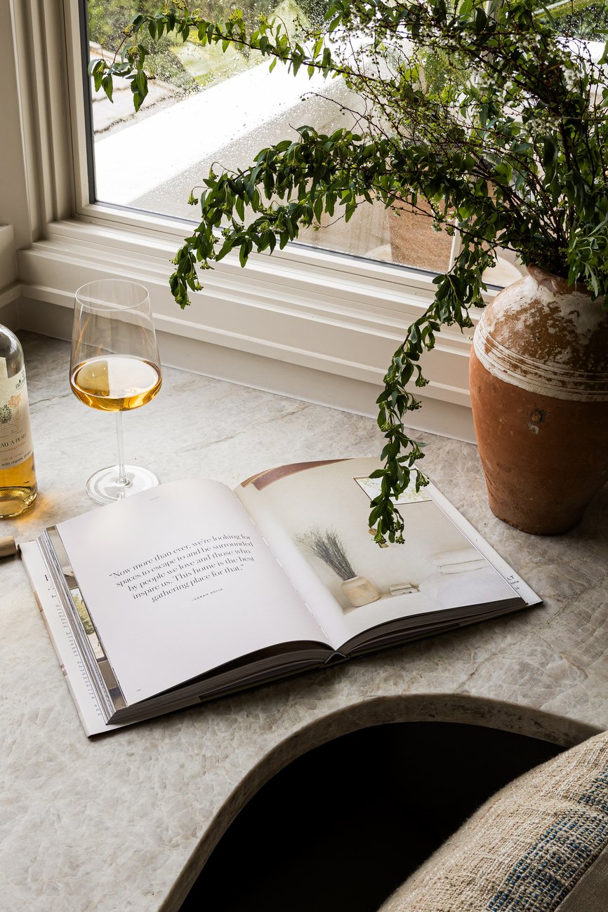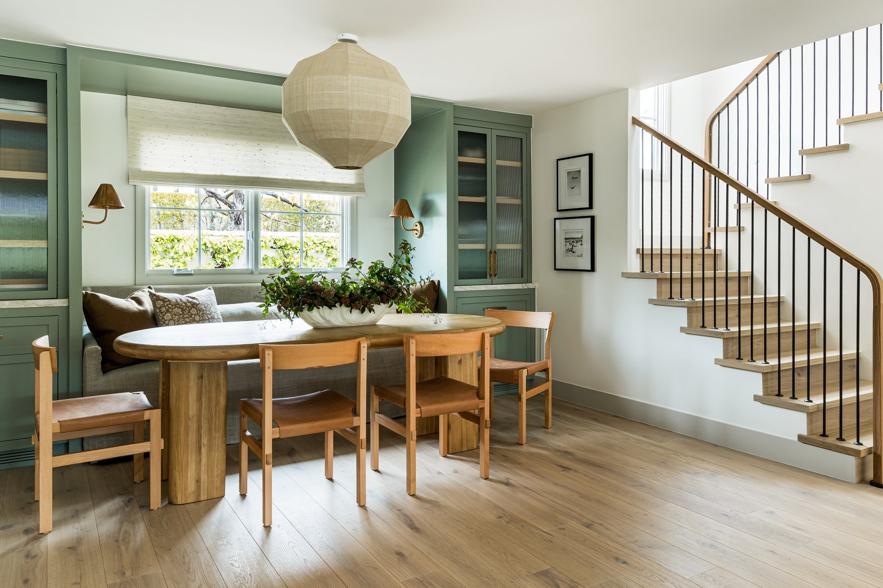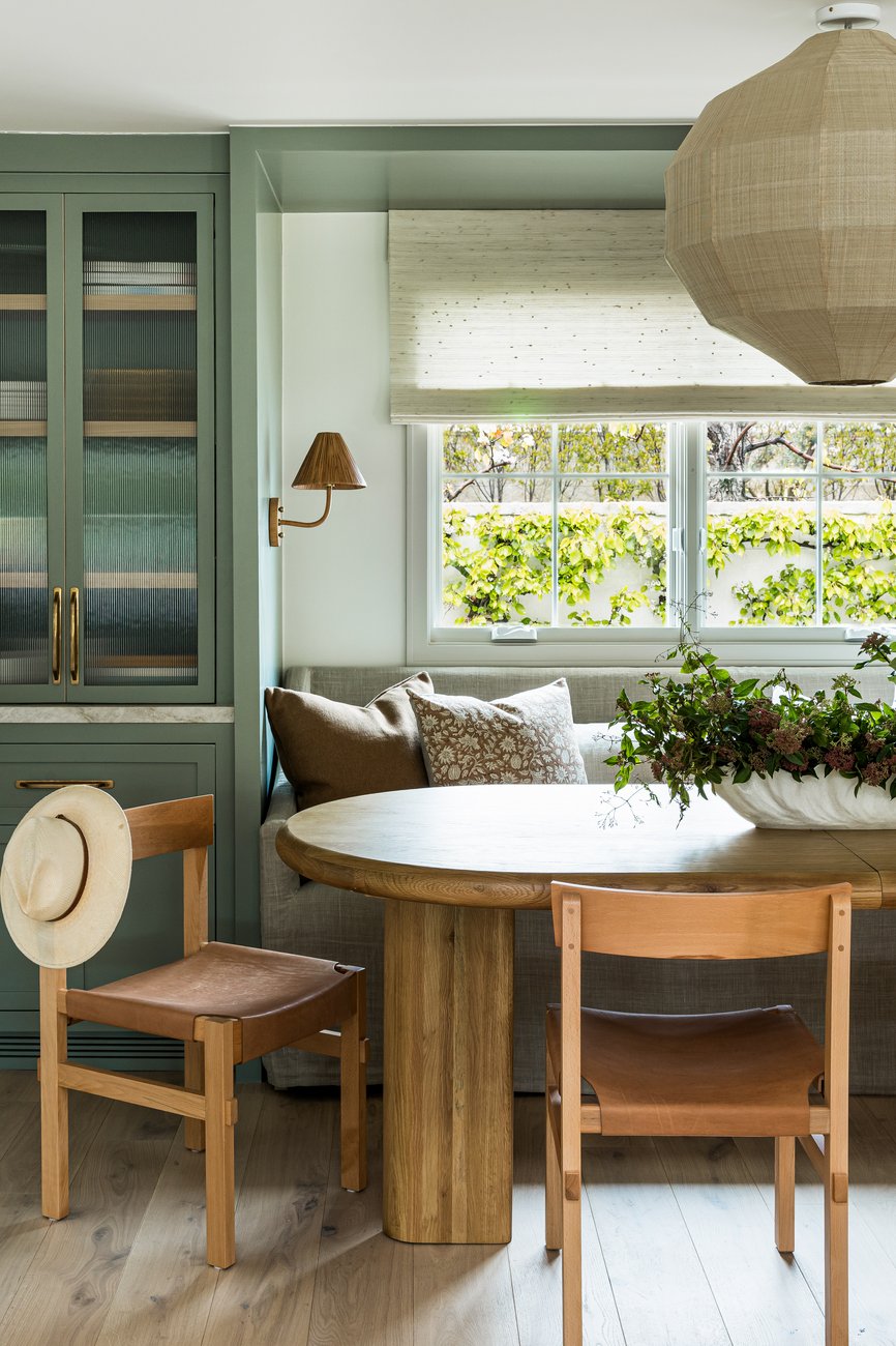 Both cozy and refined, the dining space is a cross between a nook and a formal entertaining area. With an upholstered banquette and surrounding builtins, the space is seamlessly tucked away, yet the oversized table allows for plenty of seating for entertaining. With plush accents and mixed materials in the hardware and lighting, this dining space is curated and offers comfort for gathering for hours at a time.