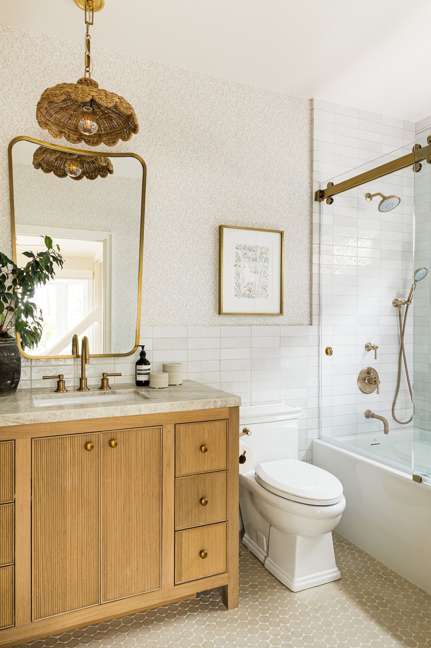 A little girl's dream room, featuring bunk beds, a slide, and tons of precious accents that make this space feel sweet and playful. Designed to grow with her as she does, this room brings whimsy and function together with modular furnishings and timeless textiles. Even her private bathroom features sweet details like scalloped lighting, dainty wallpaper, and playful tile—perfect for a little girl to grow with through the years.