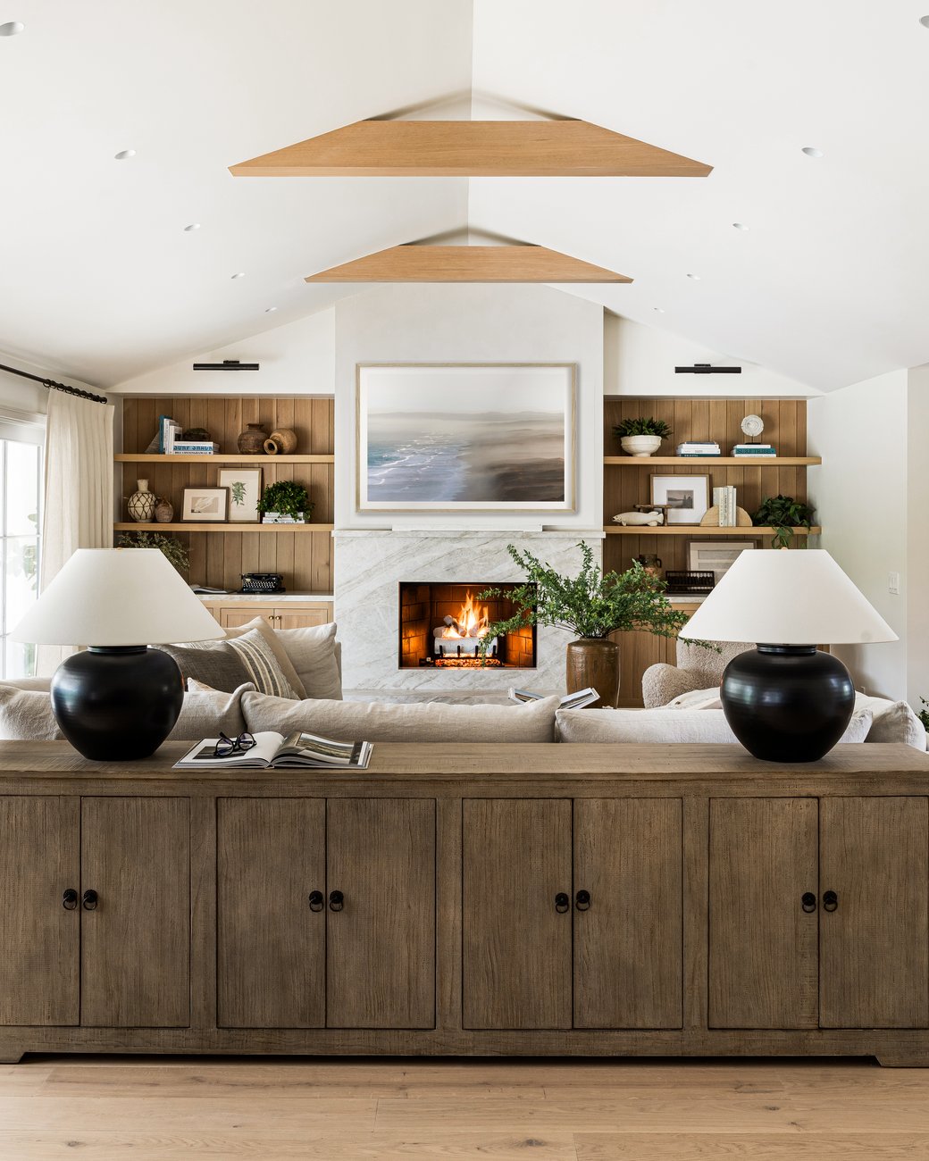 A cozy retreat, the living area of the home features an oversize sectional for family gathering and entertaining. Balanced with large windows leading to the outdoors on one wall and a built-in mantle on another, this room showcases a desire for indoor/outdoor living and integration of natural materials seamlessly into the design. This is a space meant for relaxed living—a mix of curated materials, comfortable furnishings, and unique touches that bring this coastal abode to life.
