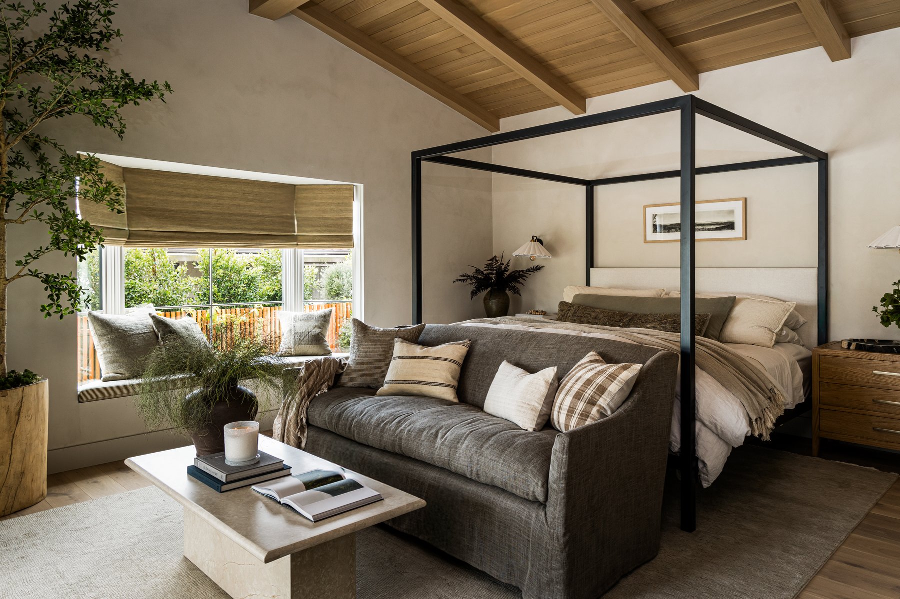 A unique feature of this home: two primary suites, one on the ground floor and one above. This more masculine space—with sleek, organic lines, paneled ceiling, and rich-toned linens—opens not the backyard with views of the pool.