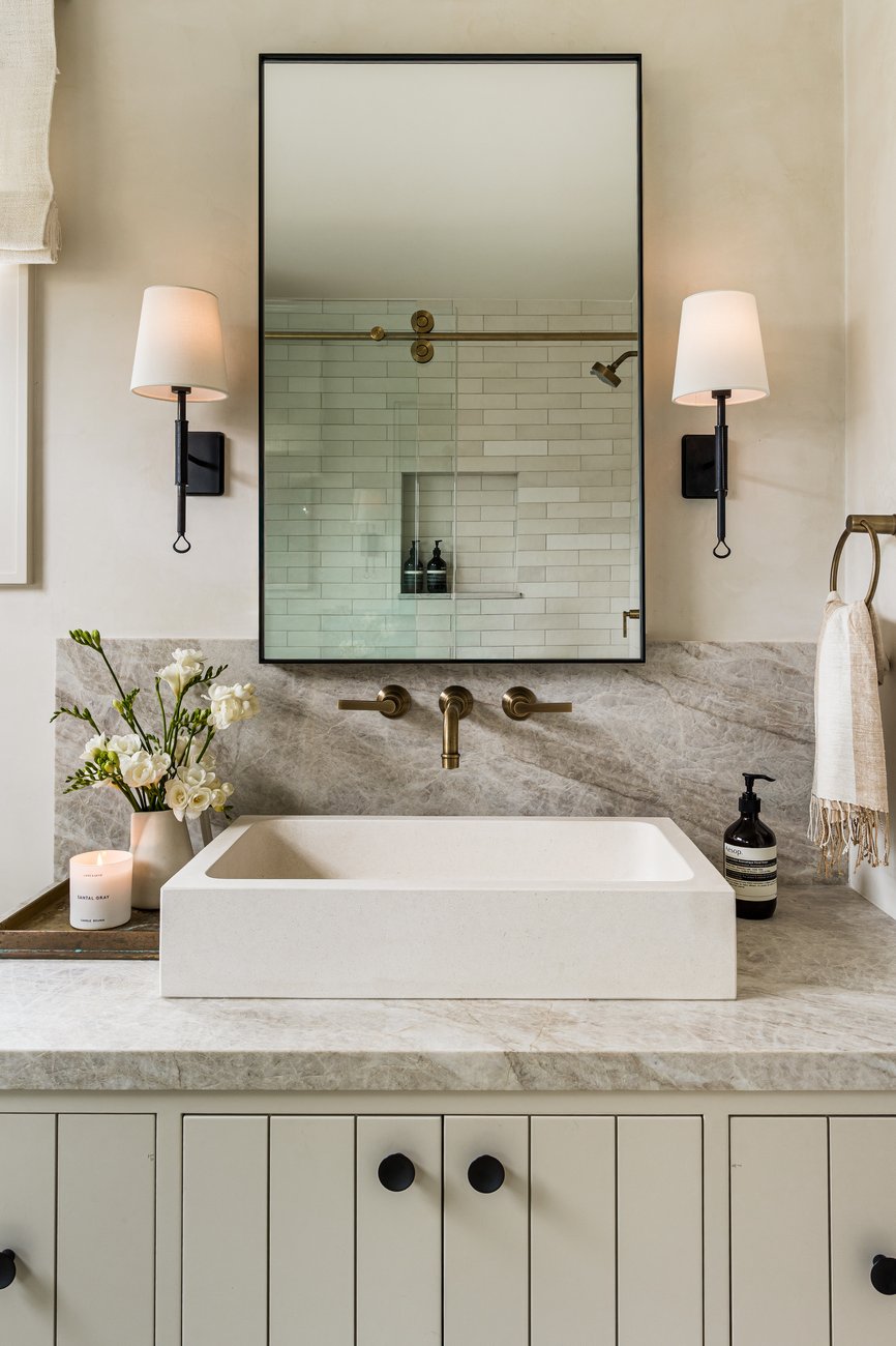 The adjoining primary bath continues that masculine sensibility with striking marble in the shower and vanity, balanced with natural white oak in the cabinetry.