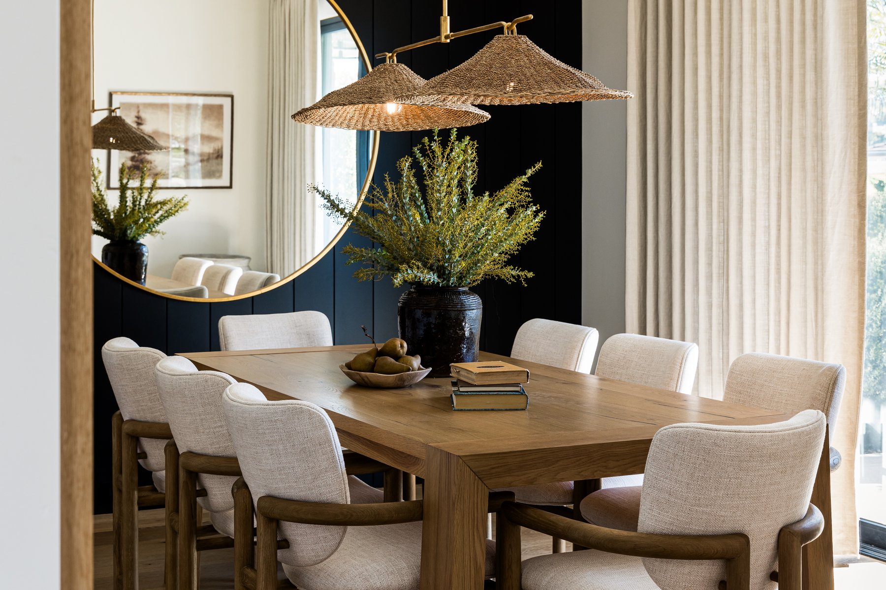 The more formal dining space still feels relaxed and inviting with comfy chairs for prolonged gathering, unique lighting to really set the mood, and subtle architectural features that add interest.