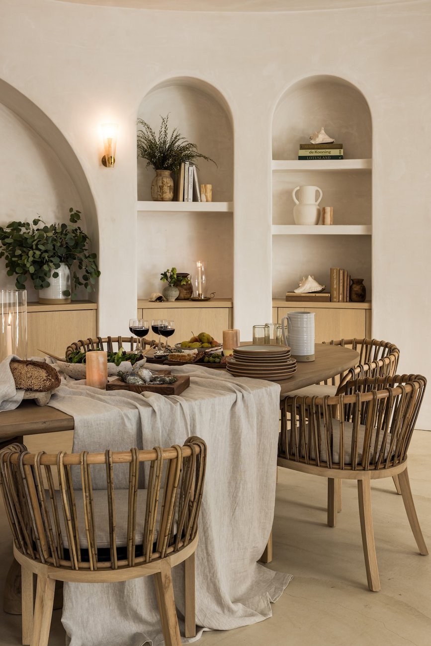 In contrast, a secondary dining nook offers a more intimate and atmospheric experience. Tucked within a series of arched built-ins, this space feels enveloped and quietly refined. The architecture creates a sense of depth and enclosure, lending itself to moodier moments: dinner parties that linger into the evening, or quiet meals that feel a touch more personal. Layered textures and curated details enhance the warmth, giving the space a collected, almost old-world charm.
