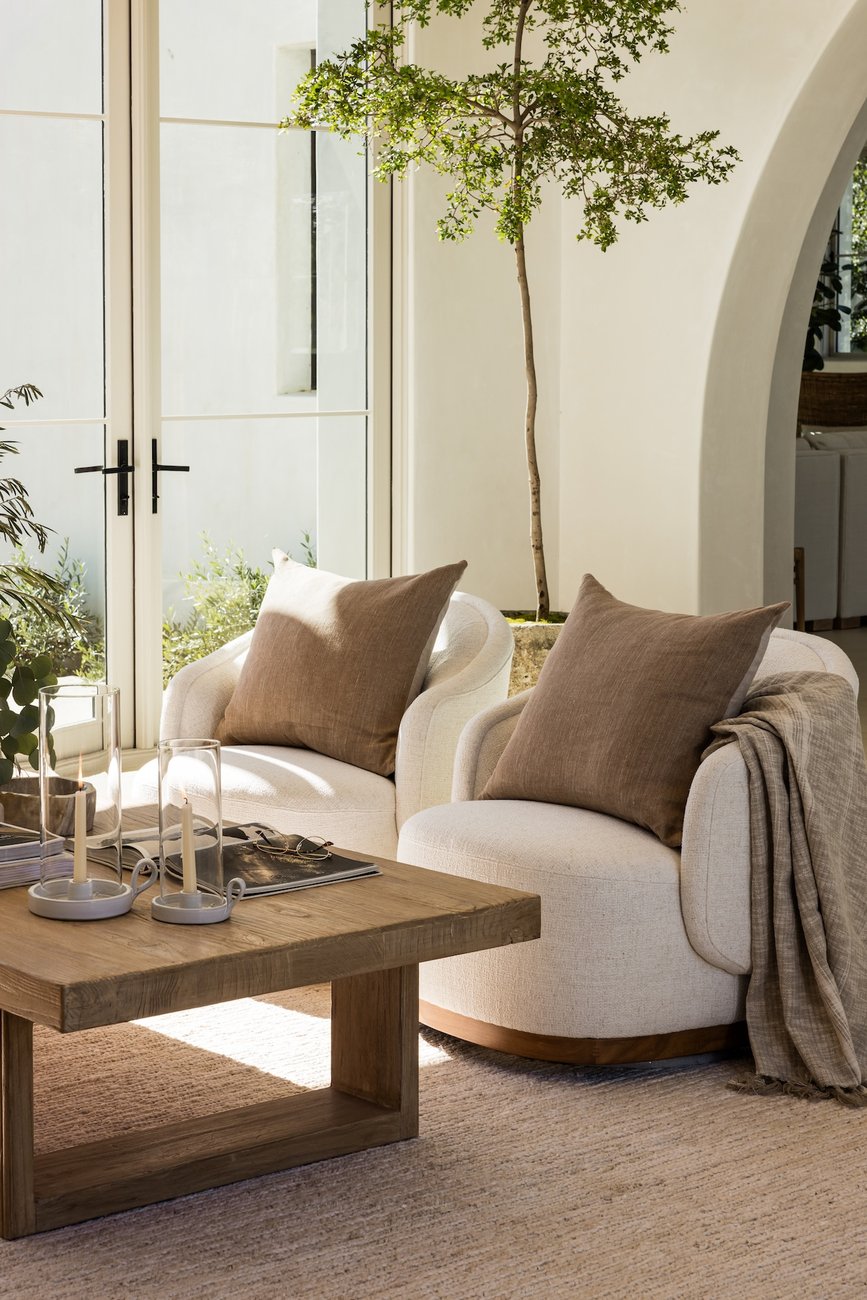 Anchored by multiple outdoor dining spaces, an expansive lounge, and framed with mature olive trees, the backyard is designed for year-round use and effortless entertaining. Low, generous seating arrangements invite conversation at every angle, while layered neutral textiles and organic silhouettes soften the architecture and echo the home’s interior palette.