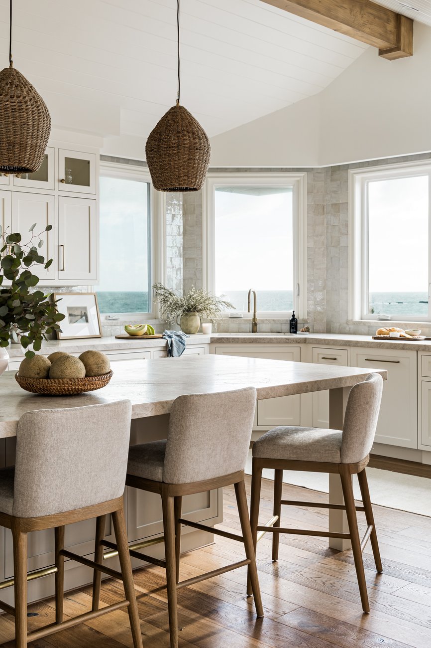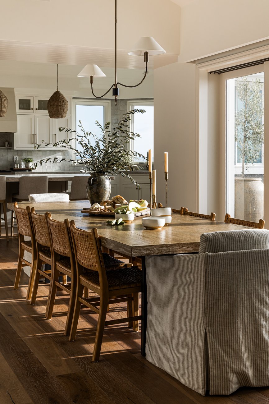 All the finishes and materials were selected to bring organic texture and relaxed living to the forefront of the design—natural woods, woven rattans, linen textiles, and tumbled stone mix together—effortlessly natural. With an open living area, it was important to emphasize the flow from one room to another with like materials and finishes. You’ll find similar slipcovered chairs in the living and dining, plus woven accents purposefully placed throughout the space.