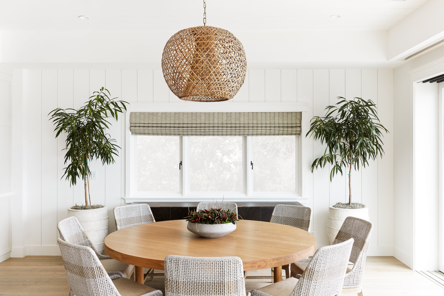 Adjacent to the kitchen, the dining area carries the same pre-meditated ease. A simple wood table surrounded by woven-textile chairs and topped with a wicker pendant embodies a quietly coastal aesthetic. Plants and greenery are placed with purpose — bringing life, texture, and softness to the clean architecture.