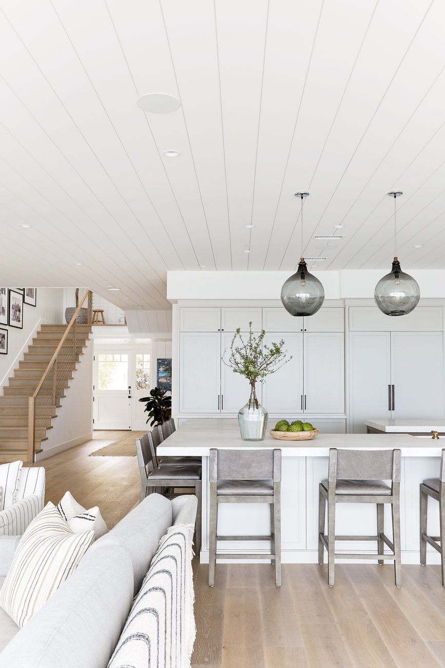 In the heart of the home, the great room unfolds as a bright, expansive living canvas. A panoramic window wall draws the eye outward toward the surf and horizon, flooding the interior with natural light that shifts through the day. White shiplap detailing and crisp, white walls elevate the feeling of air and openness, while linen sofas, soft-toned rugs, and driftwood-toned accents create a soft, lived-in warmth.